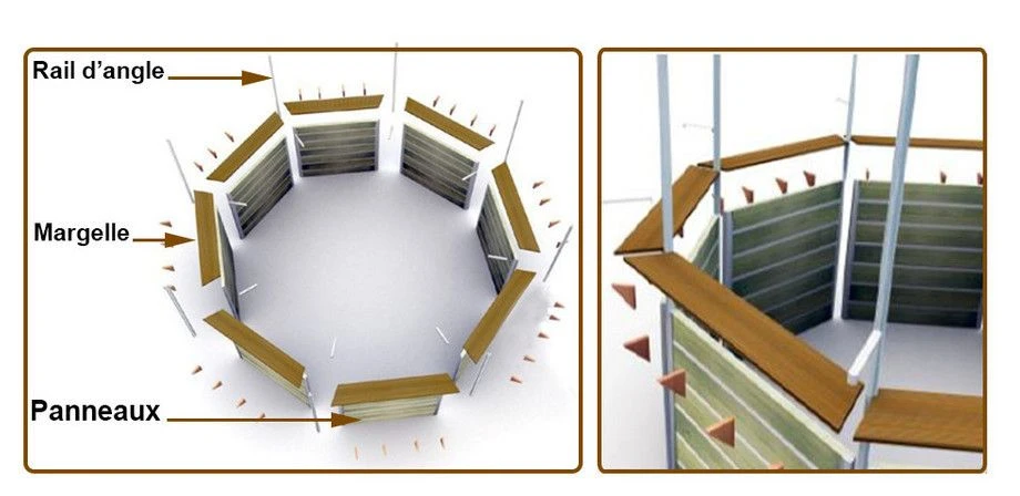 Bois : Structure à 8 panneaux pré assemblé en usine associant bois (pin du nord) traitée au Tanalith couleur Pin et aluminium / margelles bois.