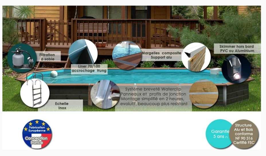 Piscine bois hors sol, semi-enterrée ou enterrée. Structure composite ou bois, margelles en bois, pin traité au Thanalit ou composite